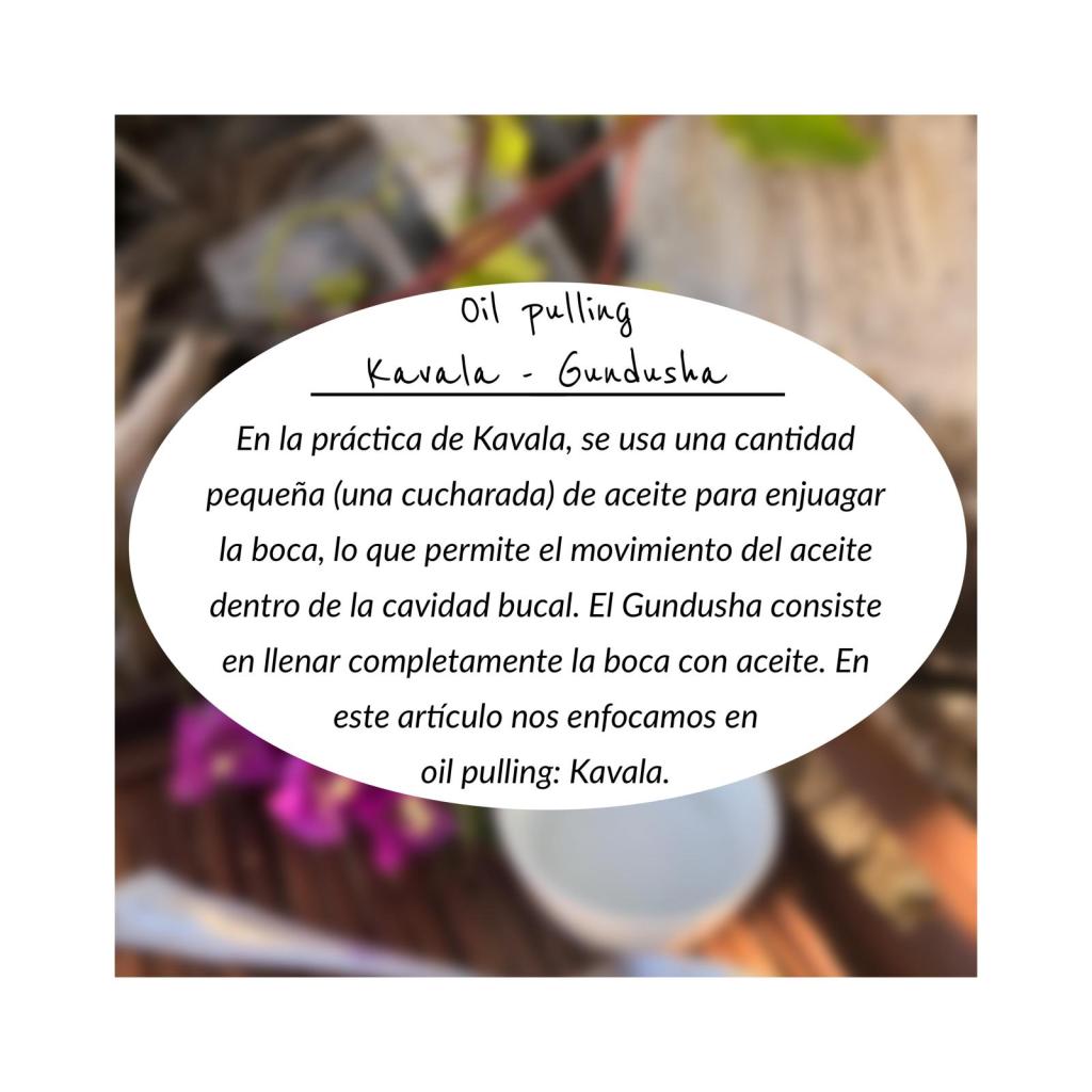 En Ayurveda, Kavala y Gundusha son dos procesos que se diferencian por la cantidad de aceite utilizada. En la práctica de Kavala se usa una cantidad pequeña (una cucharada) de aceite para enjuagar la boca, lo que permite el movimiento del aceite dentro de la cavidad bucal. El Gundusha consiste en llenar completamente la boca con aceite. En este artículo nos enfocamos en oil pulling: Kavala.
