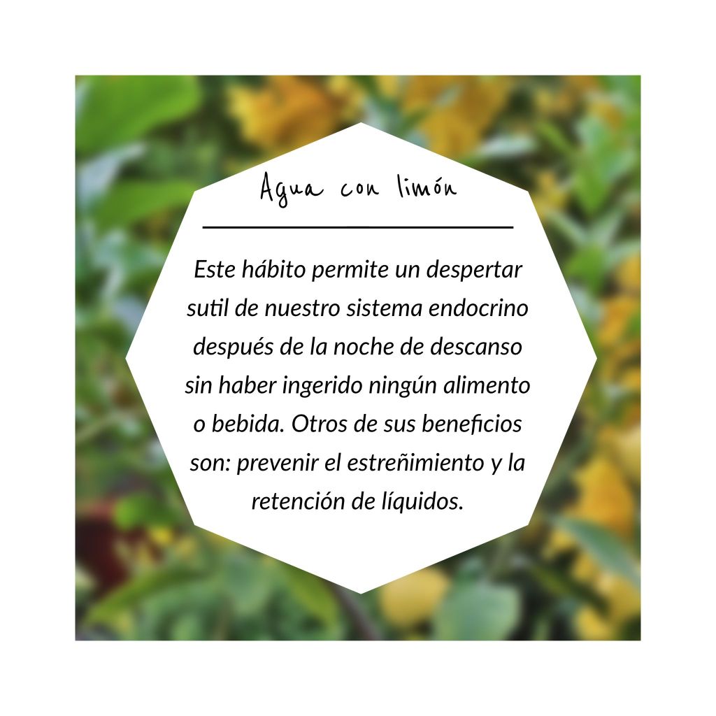 Este hábito permite un despertar sutil de nuestro sistema endocrino después de la noche de descanso sin haber ingerido ningún alimento o bebida. Otros de sus beneficios son prevenir el estreñimiento y la retención de líquidos. La cantidad ideal son 1 ó 2 tazas ingeridas sin prisa, esperar para desayunar al menos 20 minutos después de haber bebido el agua con limón o seguir con el ayuno, ya que esta bebida no interrumpe la abstinencia de alimentarse.