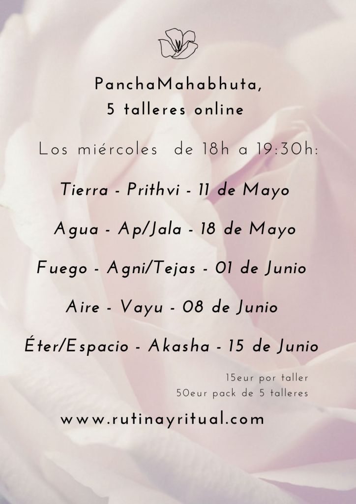 Cinco talleres online en directo sobre PanchaMahabhuta, los 5 elementos, a través de teoría y práctica, rutinas y rituales de Yoga y Ayurveda.