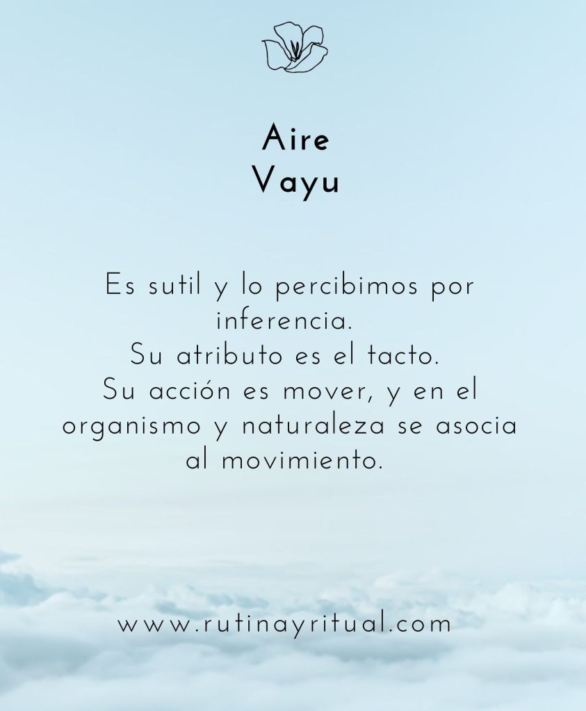 •Aire (Vayu): Es sutil y lo percibimos por inferencia. Su atributo es el tacto. Su acción es mover, y en el organismo y naturaleza se asocia al movimiento.