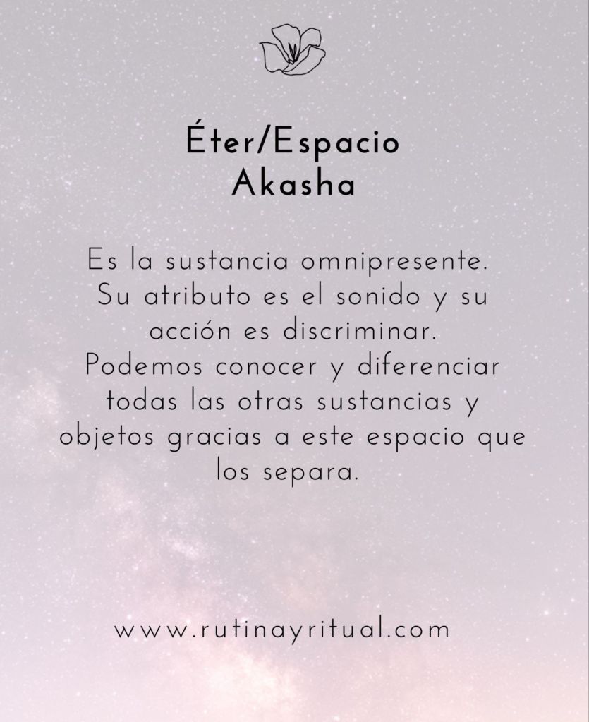•Éter/Espacio (Akasha): Es la sustancia omnipresente. Su atributo es el sonido y su acción es discriminar. Podemos conocer y diferenciar todas las otras sustancias y objetos gracias a este espacio que los separa.