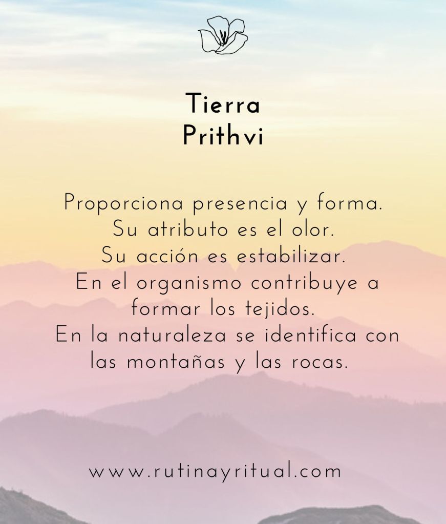 •Tierra (Prithvi): Proporciona presencia y forma. Su atributo es el olor. Su acción es estabilizar. En el organismo contribuye a formar los tejidos. En la naturaleza se identifica con las montañas y las rocas.