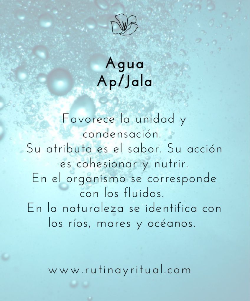 •Agua (Ap/Jala): Favorece la unidad y condensación. Su atributo es el sabor. Su acción es cohesionar y nutrir. En el organismo se corresponde con los fluidos. En la naturaleza se identifica con los ríos, mares y océanos.